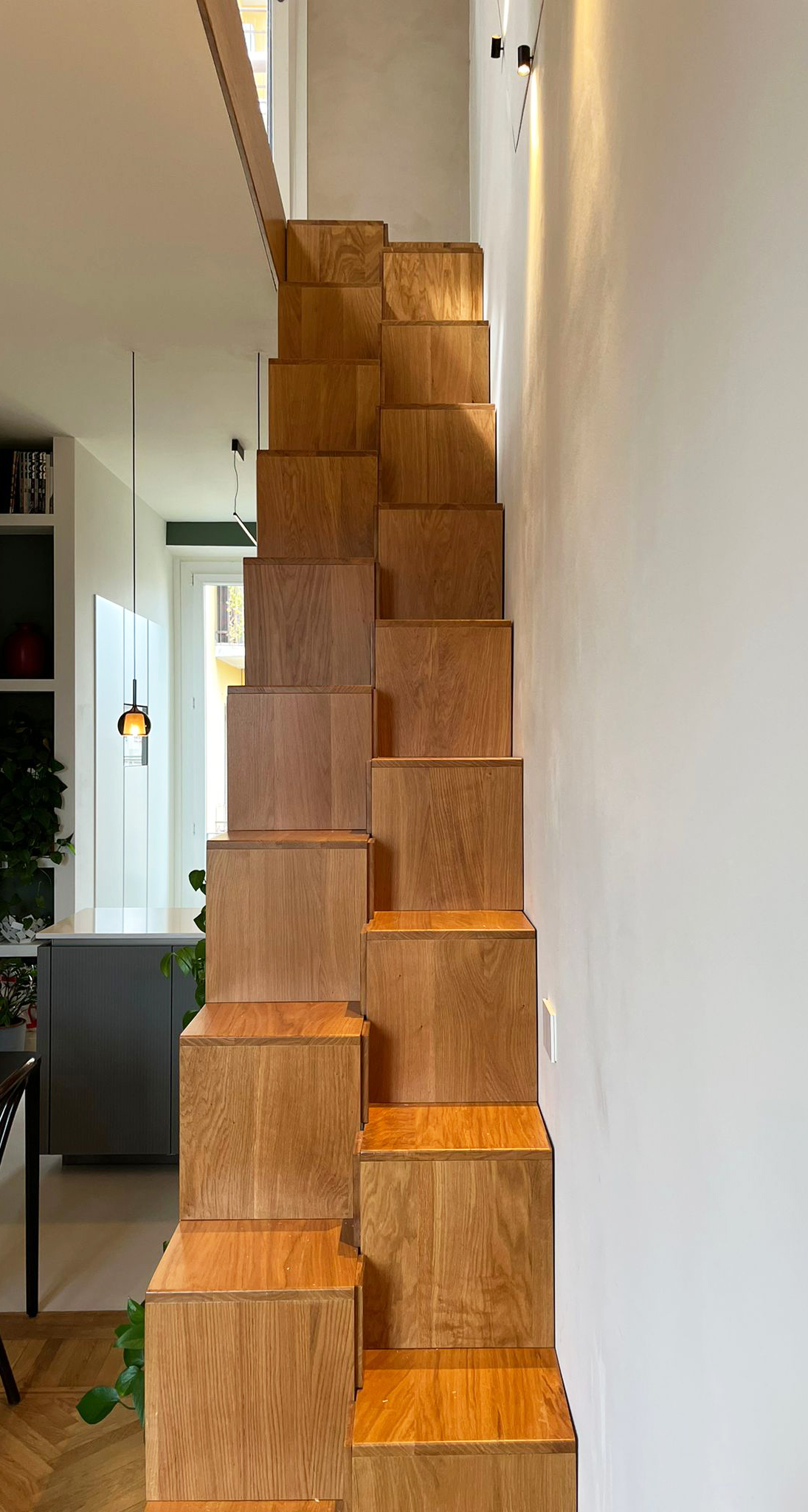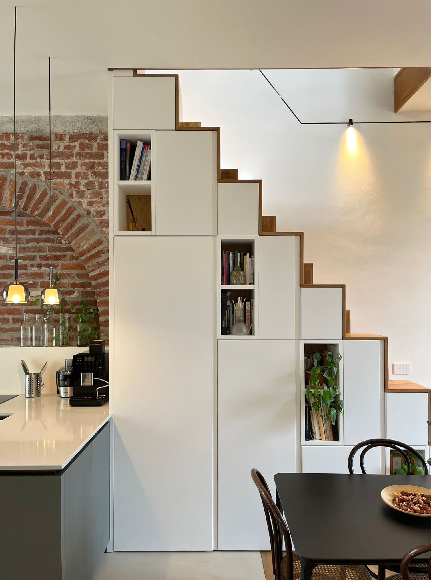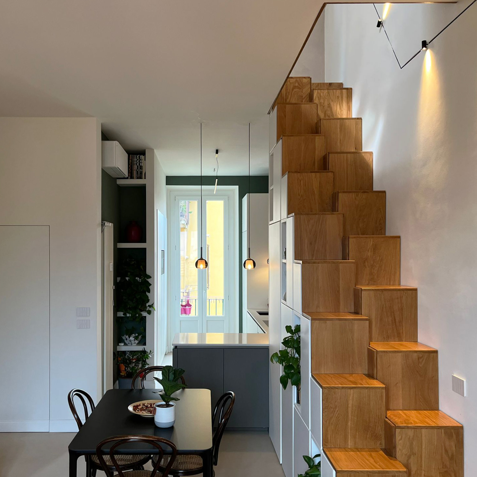 Milano 02, sito in Via Friuli, è un progetto a metà tra il restauro e la ristrutturazione, dove elementi tradizionali incontrano tecniche innovative: il progetto prevede il recupero di un sottotetto in cui vengono ricavati uno studio, un bagno e un terrazzo e il tema fondante delle scelte stilistiche diventa l’attento accostamento di elementi nuovi e materiali restaurati.